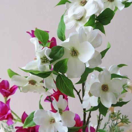 ハナミズキだから春しか飾れない、そんなことありません。今の時代世界中からお花はやってきますから。美しく可憐に咲くハナミズキに、はっきりとした色彩のワトソニアを対比させました。その延長で可憐なカンパニュラとピオニーを入れました。