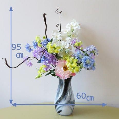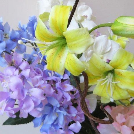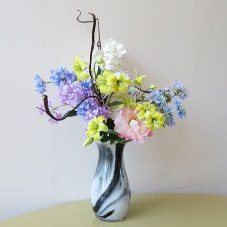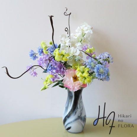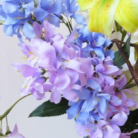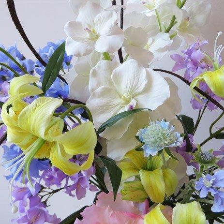 オシャレなガラス製花器に、バンダオーキッド、スカピオサ、リリー、レースフラワー、ハニーサックル、ピオニーなど高級造花でアレンジしました。サリックススレンダーも個性的です。花器が良いとお部屋の雰囲気も変わります。
