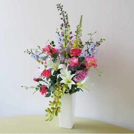 光触媒高級造花アレンジメント【キーラ】国内屈指のデルフィニウムを真ん中に据え、リリーを流してみました。高さ100cm。