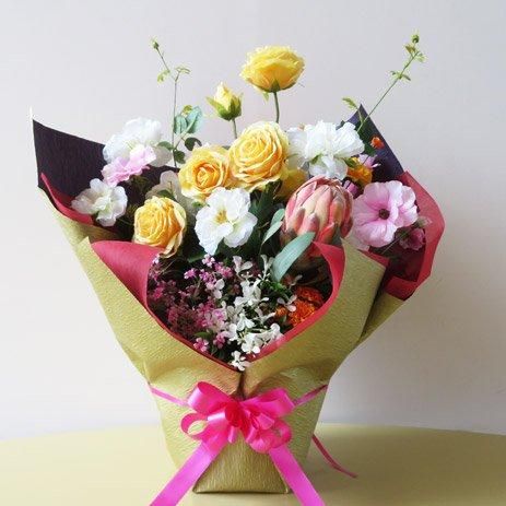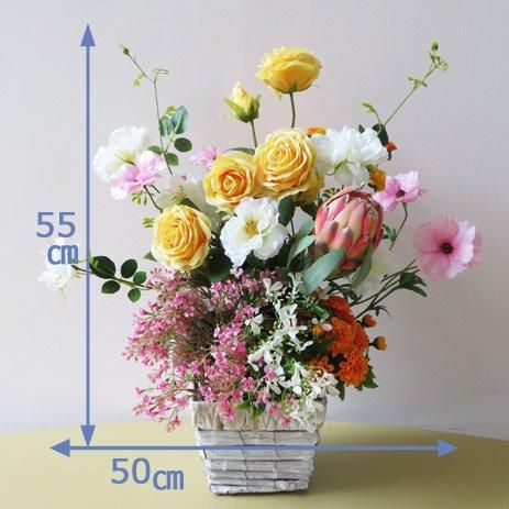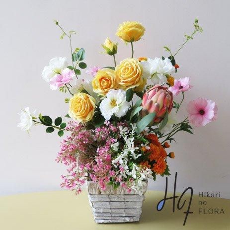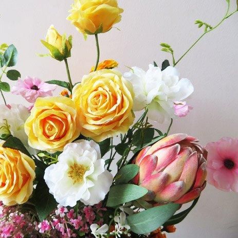 花材:マリーゴール、リュクスラナンキュラス、プロテア、バラなど