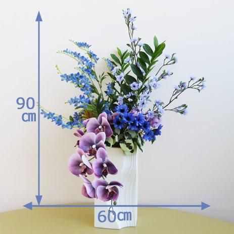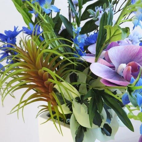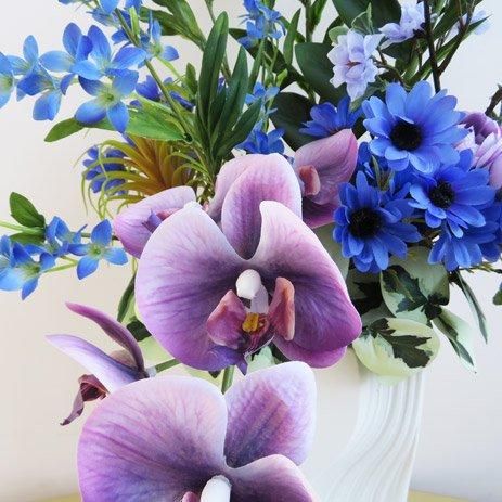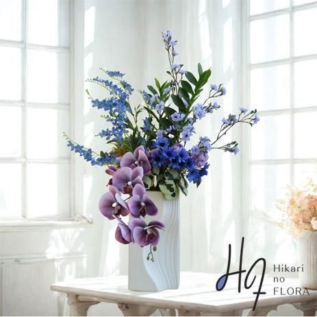 美しいデザイン性の高いファレノ・胡蝶蘭を国内トップメーカーンのモダンベースにアレンジしました。お洒落な空間づくりに、この高級造花インテリアはいかがでしょうか。花材は、胡蝶蘭、デージー、ローズ、ブロッサム、ワイルドフラワー、ティランジアなどです。