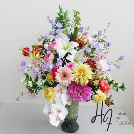 花材:カサブランカ、デルフィニューム、グロリオサ、ダリア、ピオニー、カーネーション、ジャスミン、ラナンキュラス、バラなど