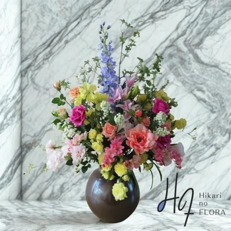 花材は、ピオニー、ジャスミン、フリージア、ノウゼンカズラ、エリカ、ライラック、デルフィニューム、リリー、ローズなどです。美しさと豪華さが際立ちます。