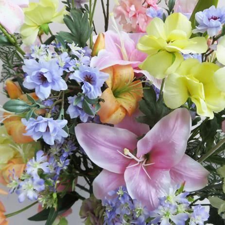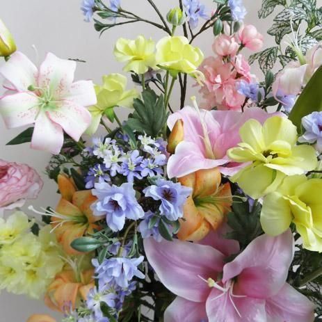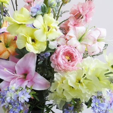 ワンランク上の11種の花々が咲きほこります。花材は、レースフラワー、デルフィニウム、リリー、ラナンキュラス、ハイドレンジア、カサブランカ、ローズなどです。どのお花も、優しさを感じる素敵な魅力を感じる高級造花インテリアです。