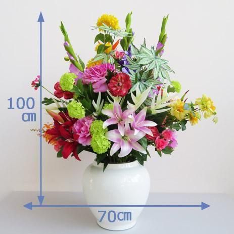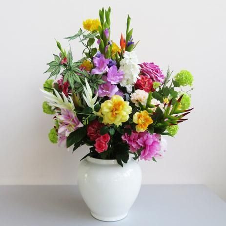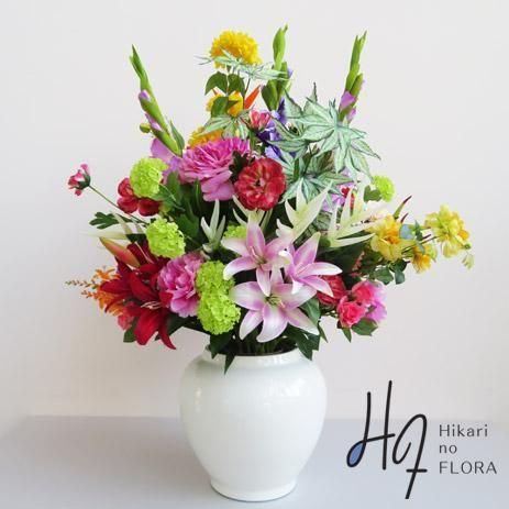 花材:デルフィニューム、ダリア、ストレチア、グロリオサ、ラナンキュラス、など22種のアーティフィシャルフラワー
