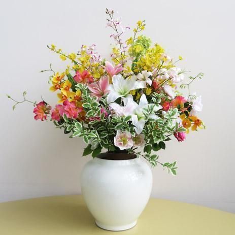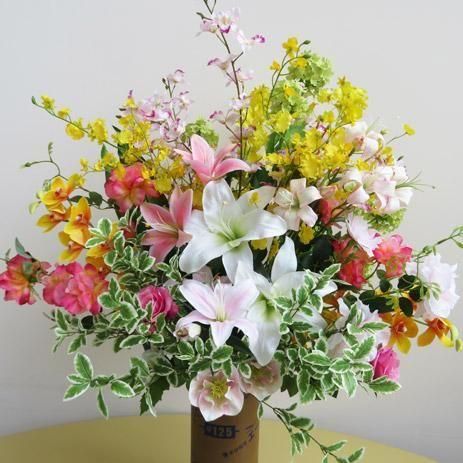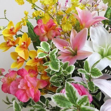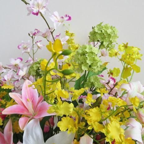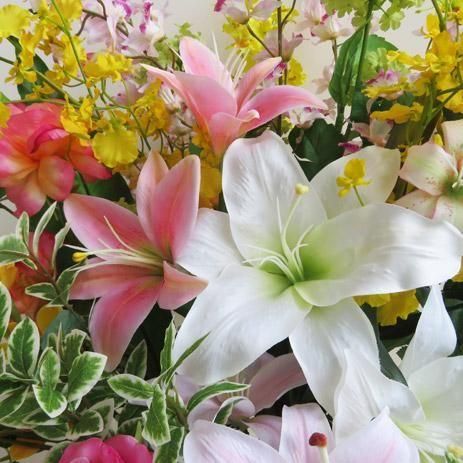 花材:オンシジューム、シンビジューム、カサブランカ、バラ、オーキッドなど15種です。