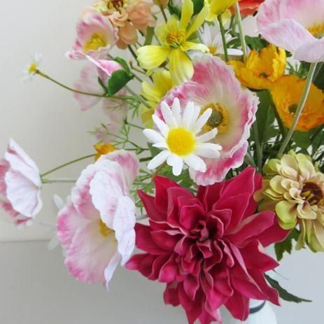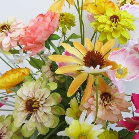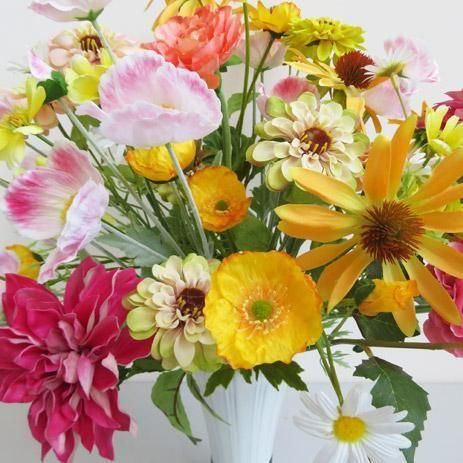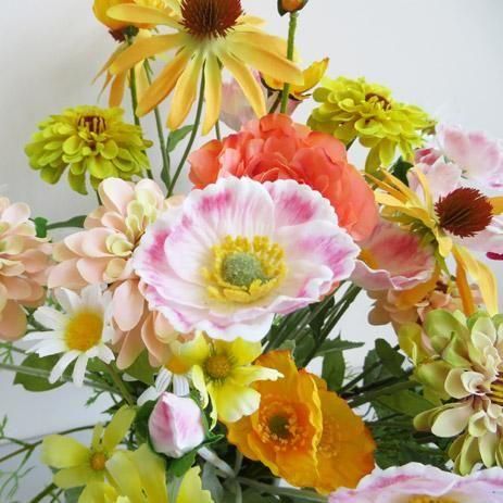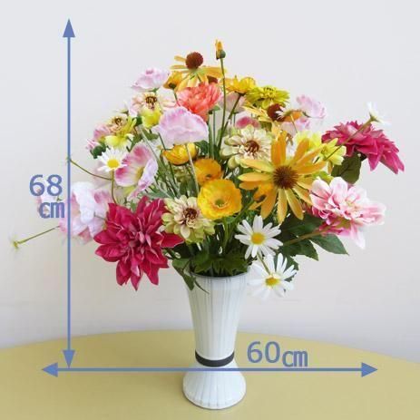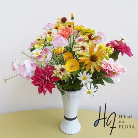 風を感じるような高級造花アレンジメントです。花材は、ラナンキュラス、ダリア、ジニア、ルドベキアなどです。個性的な花々が、優しく入れ込まれています。