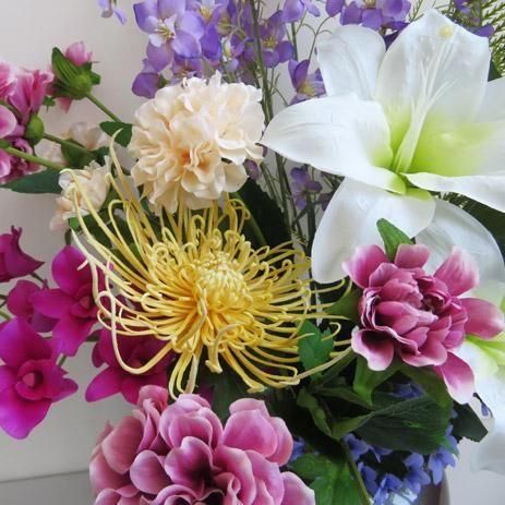 カサブランカを中心に、和洋折衷に花々をアレンジしてみました。黄色のクロコスミア、ダリア、デンファレノ、ラクスパーなど入れました。