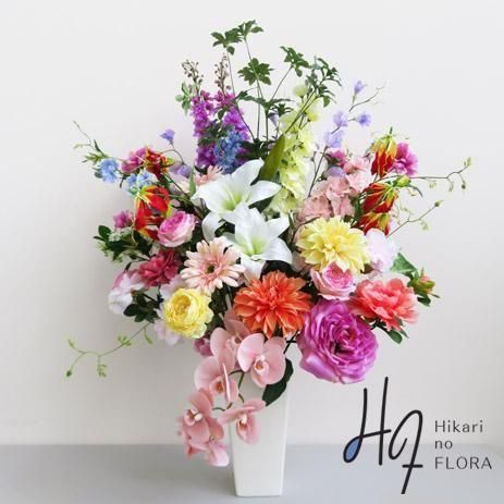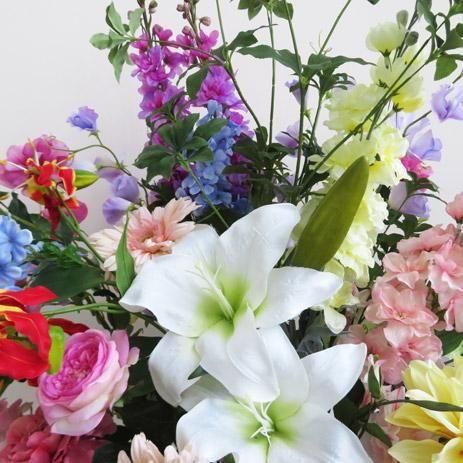 花材:胡蝶蘭、デルフィニューム、カサブランカ、バラ、グロリオサなど15種です。