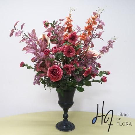 セピアの世界観も素敵ですね。アーティフィシャルフラワー(高級造花)で構成されています。デルフィニューム、ラナンキュラス、マリーゴールド、アンスリウム、ユーカリなどを使用しています。今年の新素材を多用しています。