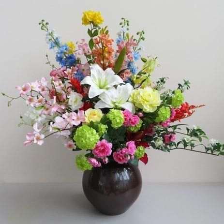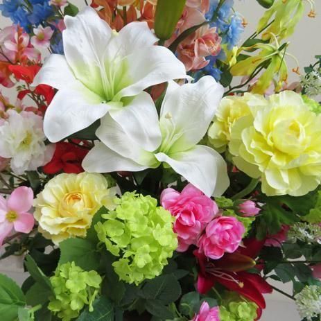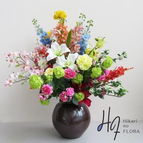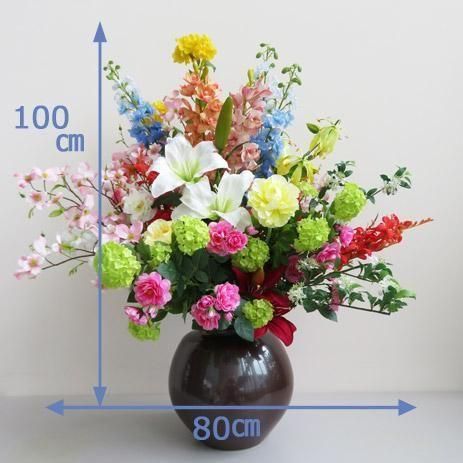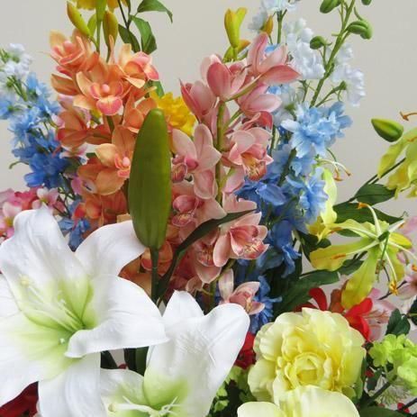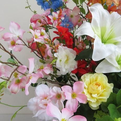 花材:ハナミズキ、シンビジューム、、デルフィニューム、カサブランカ、バラ、コデマリなどアーティフィシャルフラワー(高級造花)15種です。