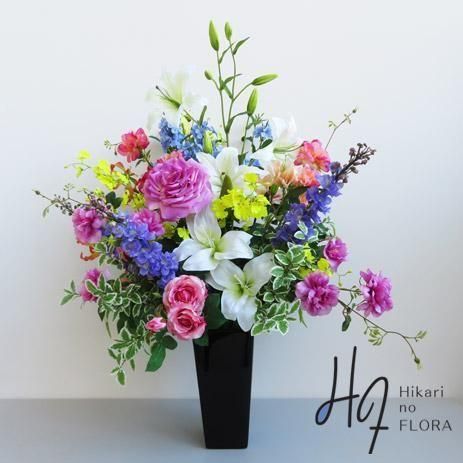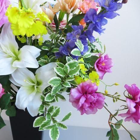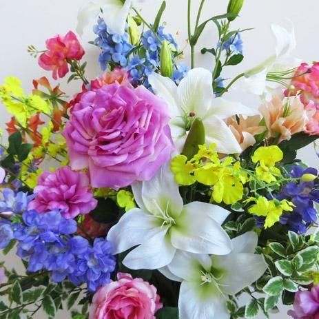 花材:ハナミズキ、シンビジューム、、デルフィニューム、カサブランカ、バラ、コデマリなどアーティフィシャルフラワー(高級造花)15種です。
