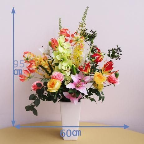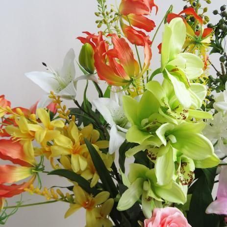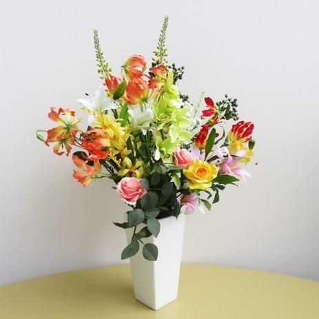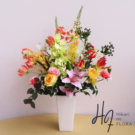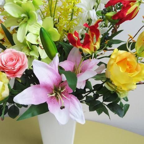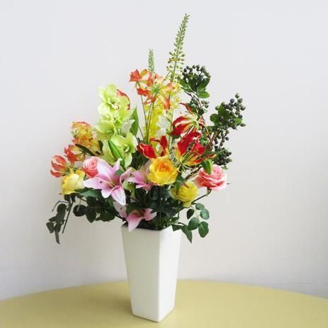 とても明るい高級造花アレンジメントです。花材は、アーティフィシャルフラワーと呼ばれるワンランク上の品を用いています。