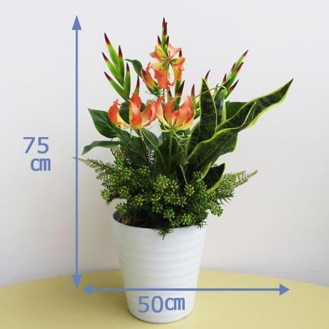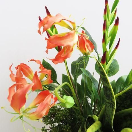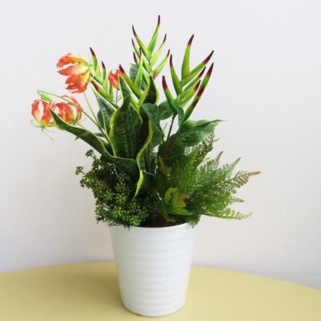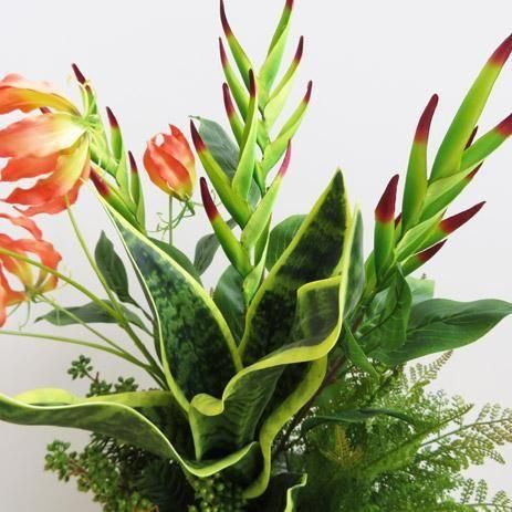 サンセベリアとヘリコニア、グロリオサをアレンジした人工観葉植物です。