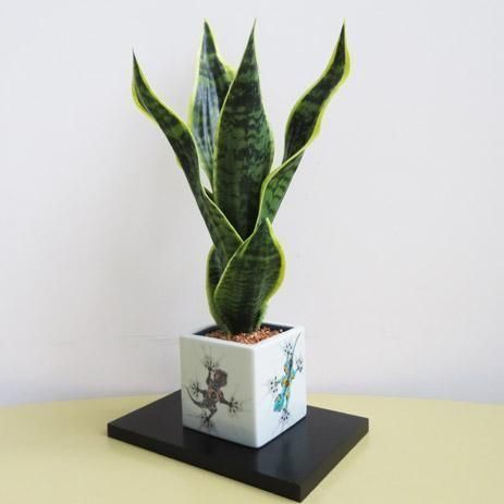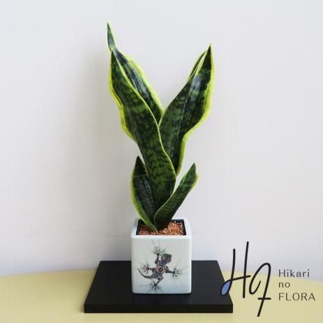 九谷焼伝統工芸士・山近泰が描く「家守(ヤモリ)」は、古くから「家を守る守り神」として、また「金運・幸運を呼び込む縁起物」として親しまれてきました。その縁起の良いヤモリをあしらった気品あふれる九谷焼花器に、お手入れ不要の人工観葉植物・サンセベリアをアレンジしました。