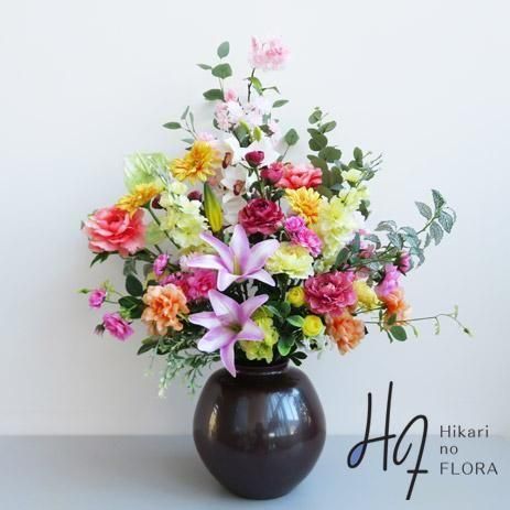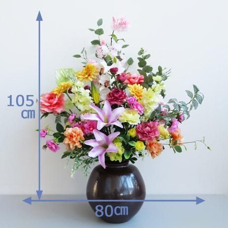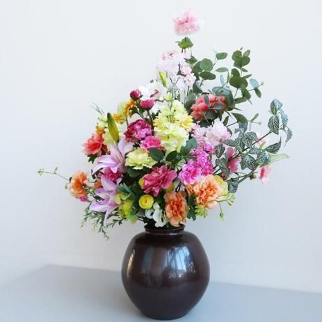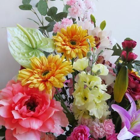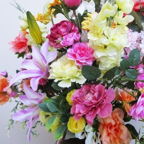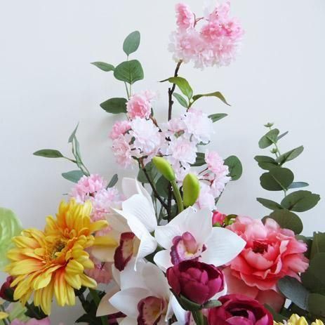 花材:八重桜、シンビジューム、、デルフィニューム、カサブランカ、バラ、アンスリウムなどアーティフィシャルフラワー(高級造花)18種です。